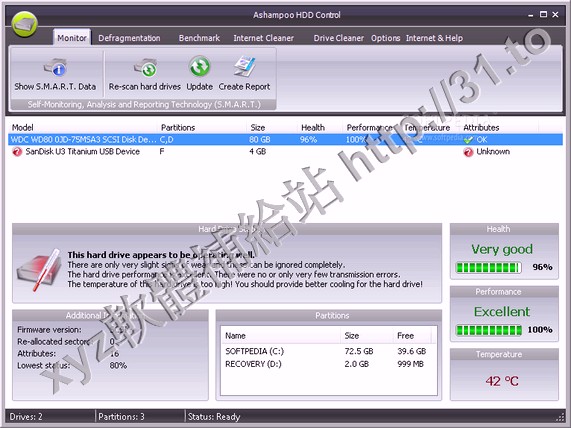 • Ashampoo HDD Control 2 v2.06 英文正式版(具有監視、重組、效能評定、清理、還原等多項實用功能硬碟軟體)